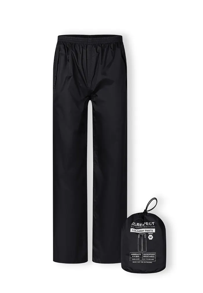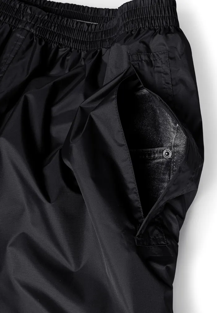 Lightweight, rain trousers packed in a handy pouch. Trousers with elastic waistband and side openings for easy access to pockets. Velcro adjustment at the bottom of the legs.