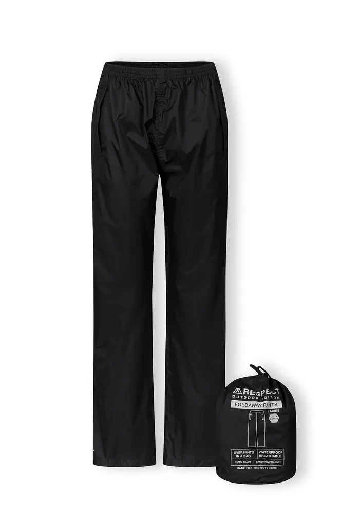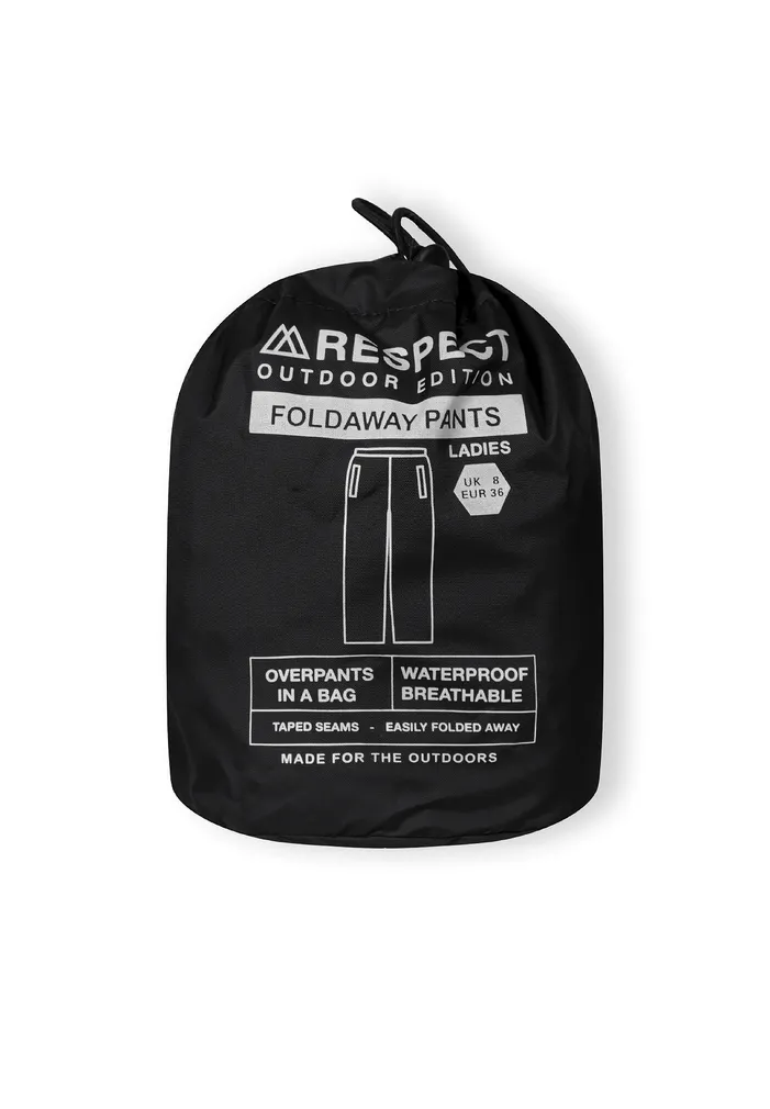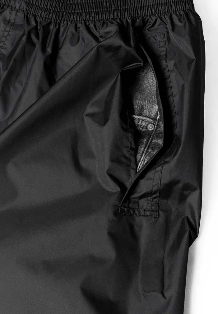Lightweight, rain trousers packed in a handy pouch. Trousers with elastic waistband and side openings for easy access to pockets. Velcro adjustment at the bottom of the legs.