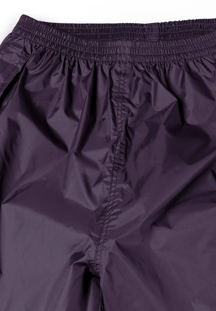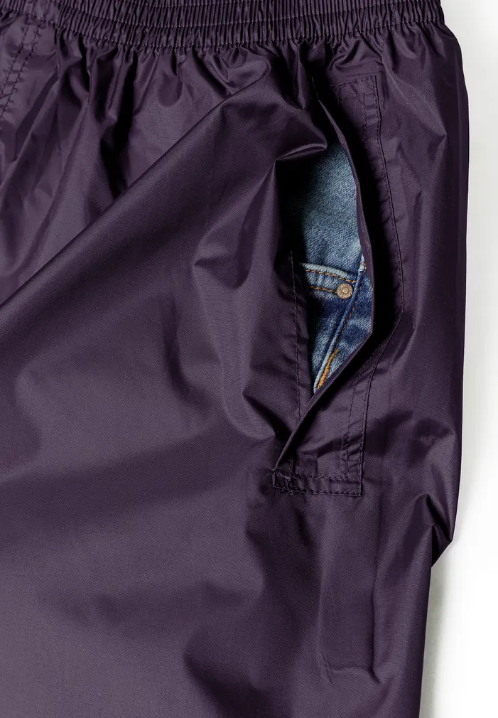 Lightweight, rain trousers packed in a handy pouch. Trousers with elastic waistband and side openings for easy access to pockets. Velcro adjustment at the bottom of the legs.