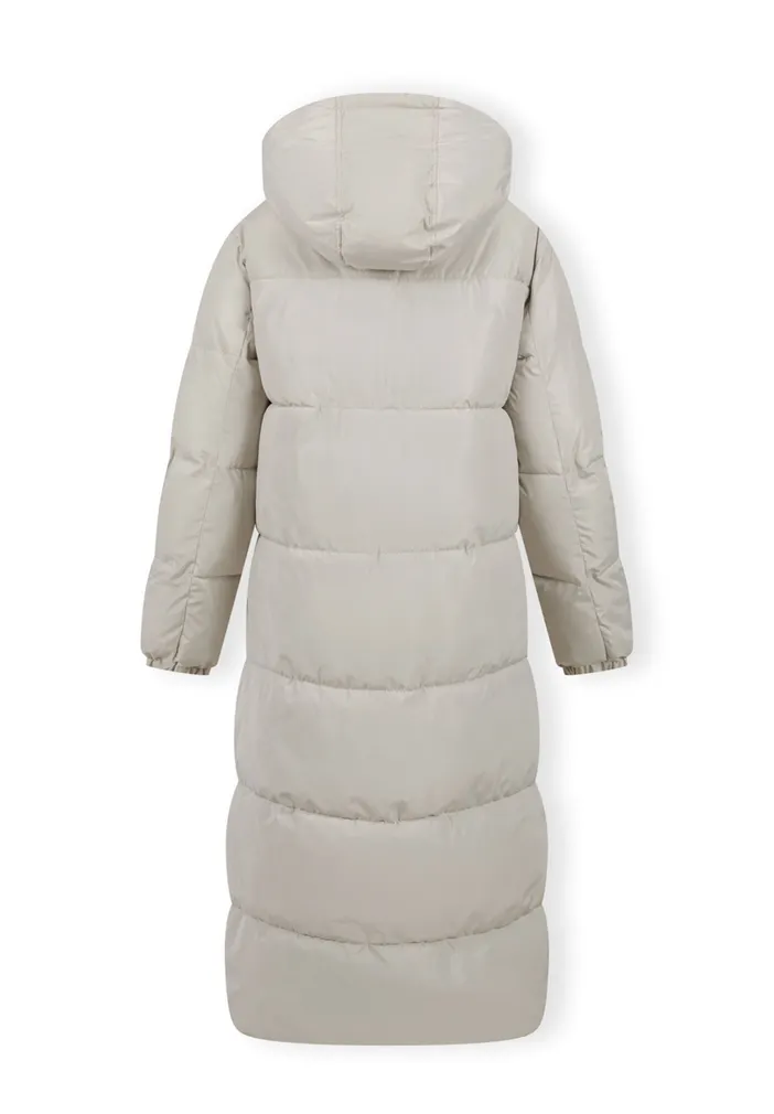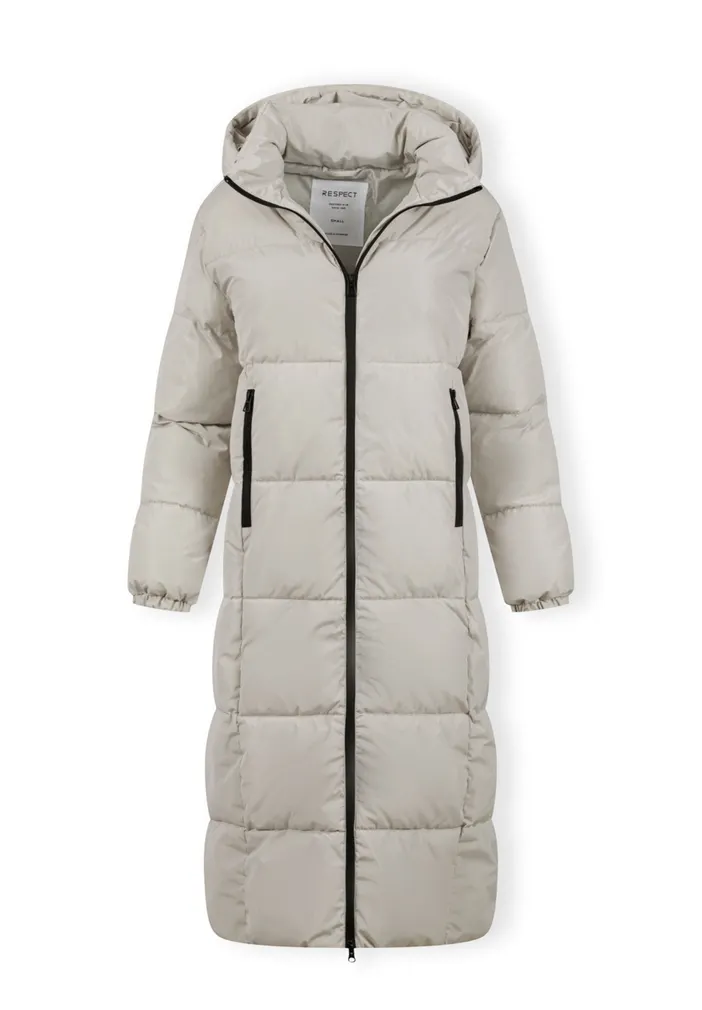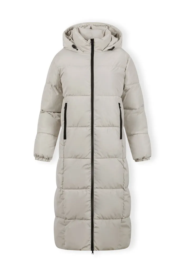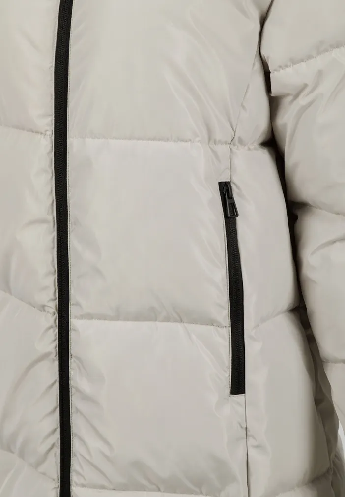 Long quilted winter jacket is made to keep warmth in and moisture out. Designed with a high collar, padded filling, and soft lining, it offers full protection during cold weather. The hood is fixed and adjustable with elastic cords. The front features a full-length contrasting zipper, and zipped side openings allow for greater comfort while walking or sitting. Two vertical zipped pockets provide secure storage. The sleeves are finished with soft elastic bands for a snug fit.
