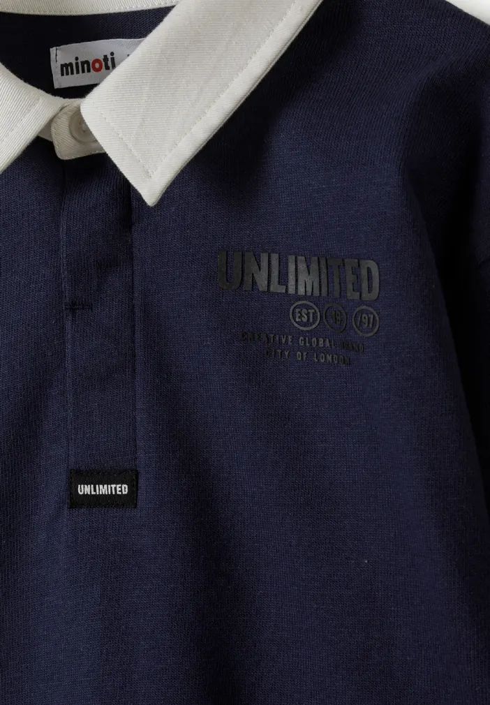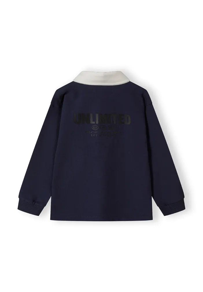 This rugby-style long sleeve top stands out with bold print details. Designed with a structured woven collar and concealed placket, it features a small chest graphic and a large statement print across the back. Ribbed cuffs and soft fabric ensure comfort all day, while the contrasting collar adds a sporty twist. A versatile choice for school, play or casual styling with a bold edge.