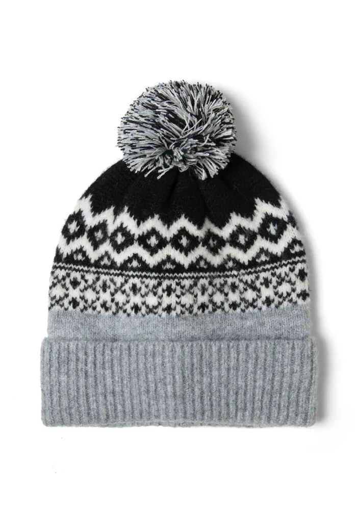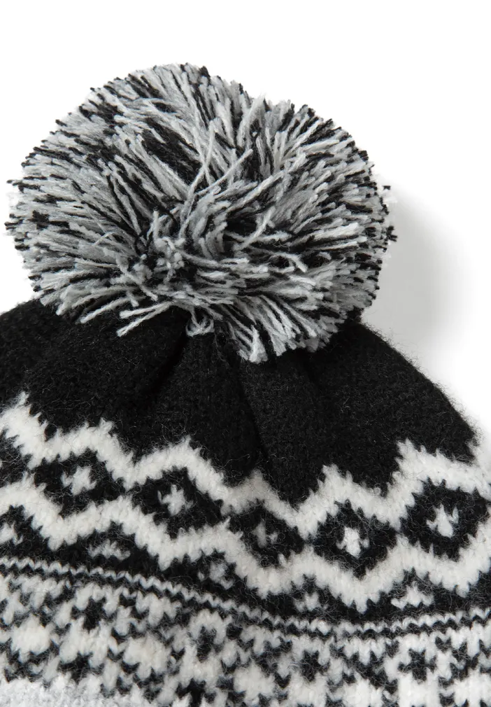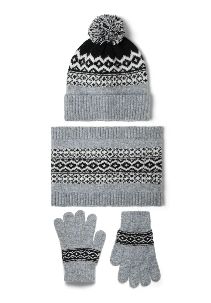 Three-piece winter set is the perfect combination of warmth and style for little ones during chilly months. Featuring a classic fair isle pattern, the set includes a knit hat with pompom and turn-up cuff, matching gloves with ribbed cuffs, and a pull-on snood. The soft-touch knit fabric is gentle on skin and keeps children cozy without overheating. Easy to wear, this set makes cold-weather dressing both simple and adorable.