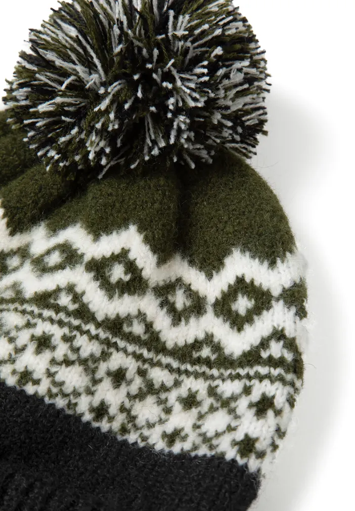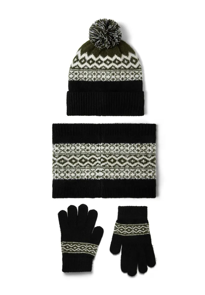 Three-piece winter set is the perfect combination of warmth and style for little ones during chilly months. Featuring a classic fair isle pattern, the set includes a knit hat with pompom and turn-up cuff, matching gloves with ribbed cuffs, and a pull-on snood. The soft-touch knit fabric is gentle on skin and keeps children cozy without overheating. Easy to wear, this set makes cold-weather dressing both simple and adorable.